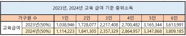 교육 급여의 소득 요건은 2023년, 2024년 동일하게 기준 중위소득의 50% 이하에 적용되며, 기소생활 수급가구의 초등학교, 중학교, 고등학교 학생들에게 교육활동을 위한 지원비를 지급하는 제도입니다.